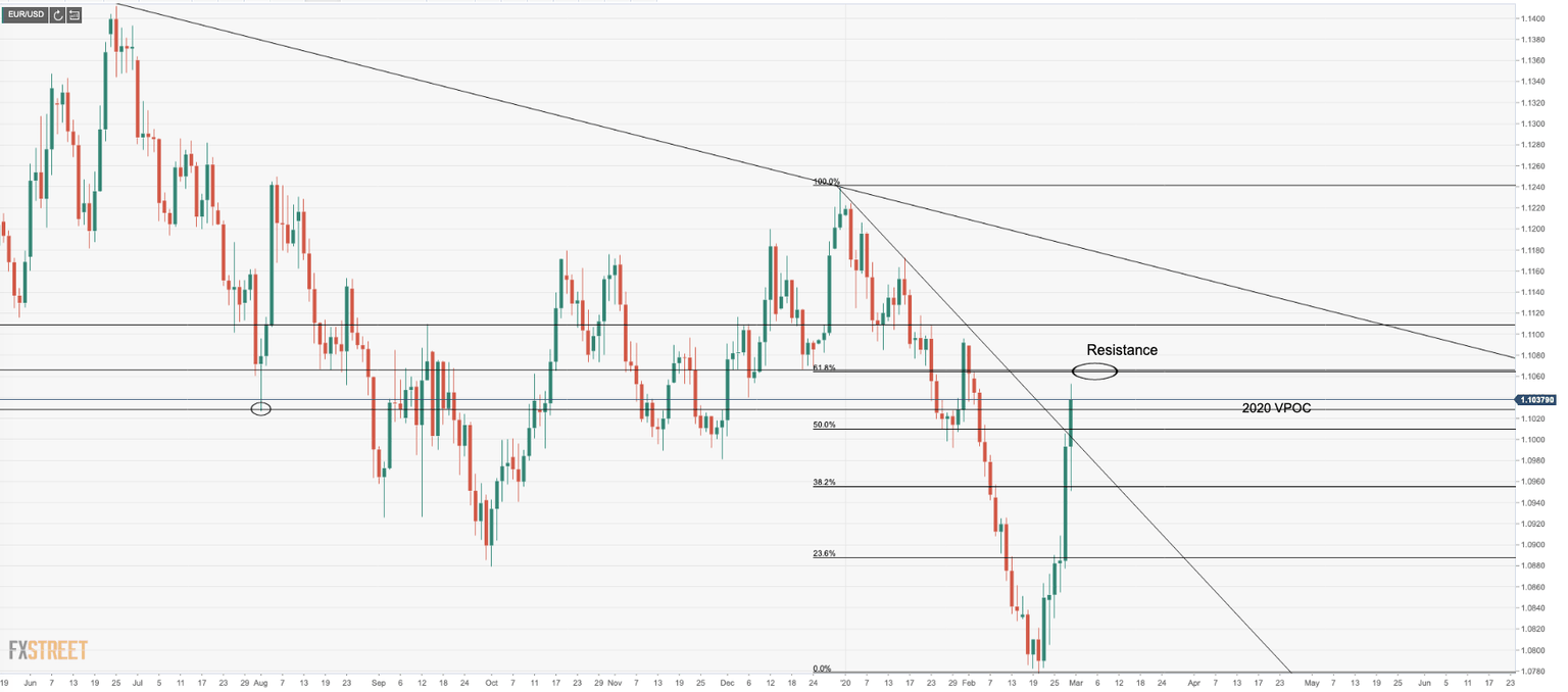 While there is room to the weekly trendline, the 1.1150s, there is a fairly high hurdle above 1.1095 (2020 VPOC) for a continuation of EUR/USD rally at this juncture. The path of least resistance appears to be to the downside when factoring in the volume profile and the 61.8% Fibonacci retracement of the 31st December peak to YTD lows. The 1.1095 (2020 VPOC) would usually act as a magnet/support/resistance target, so it should not be ignored at this juncture, despite the recent rally sitting in overbought conditions.