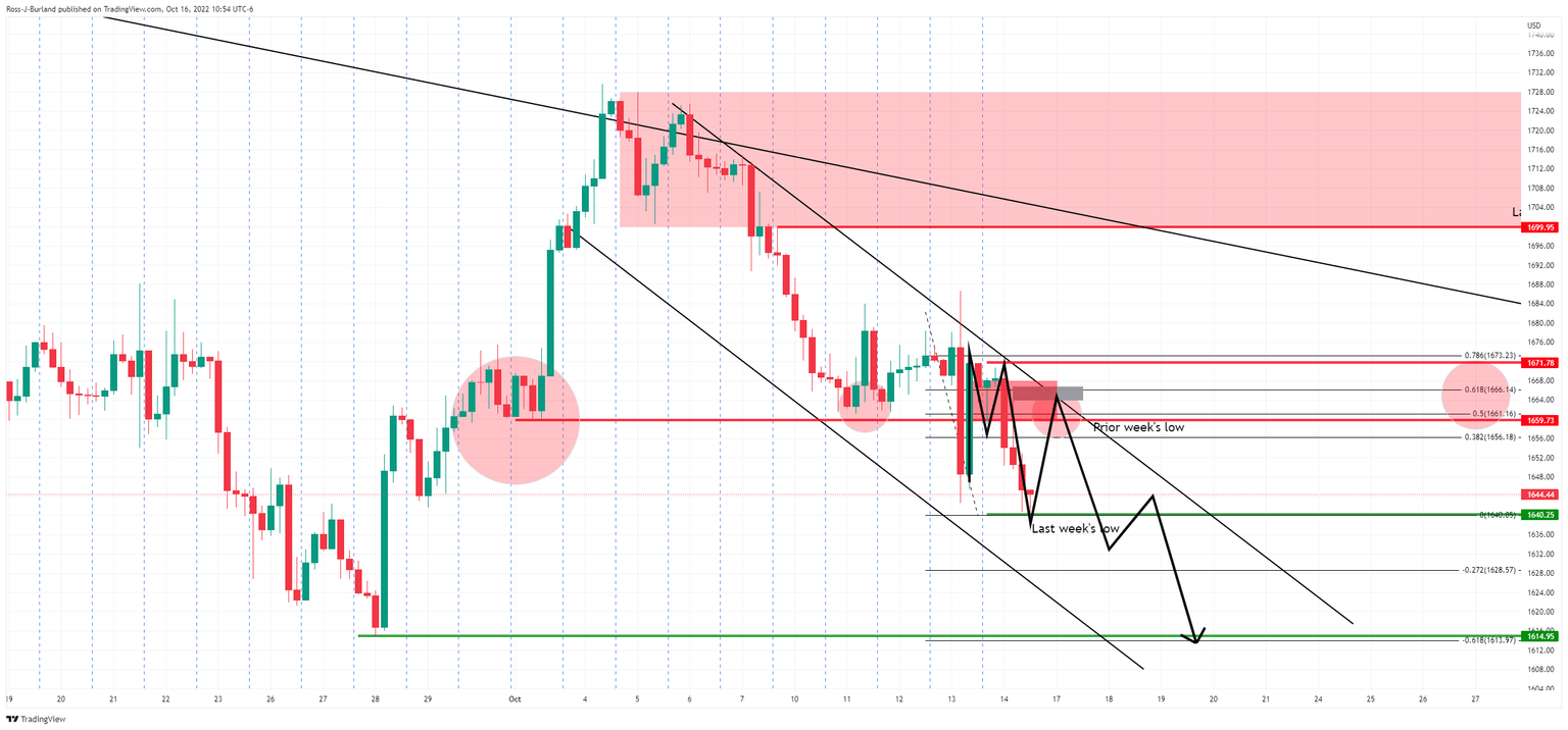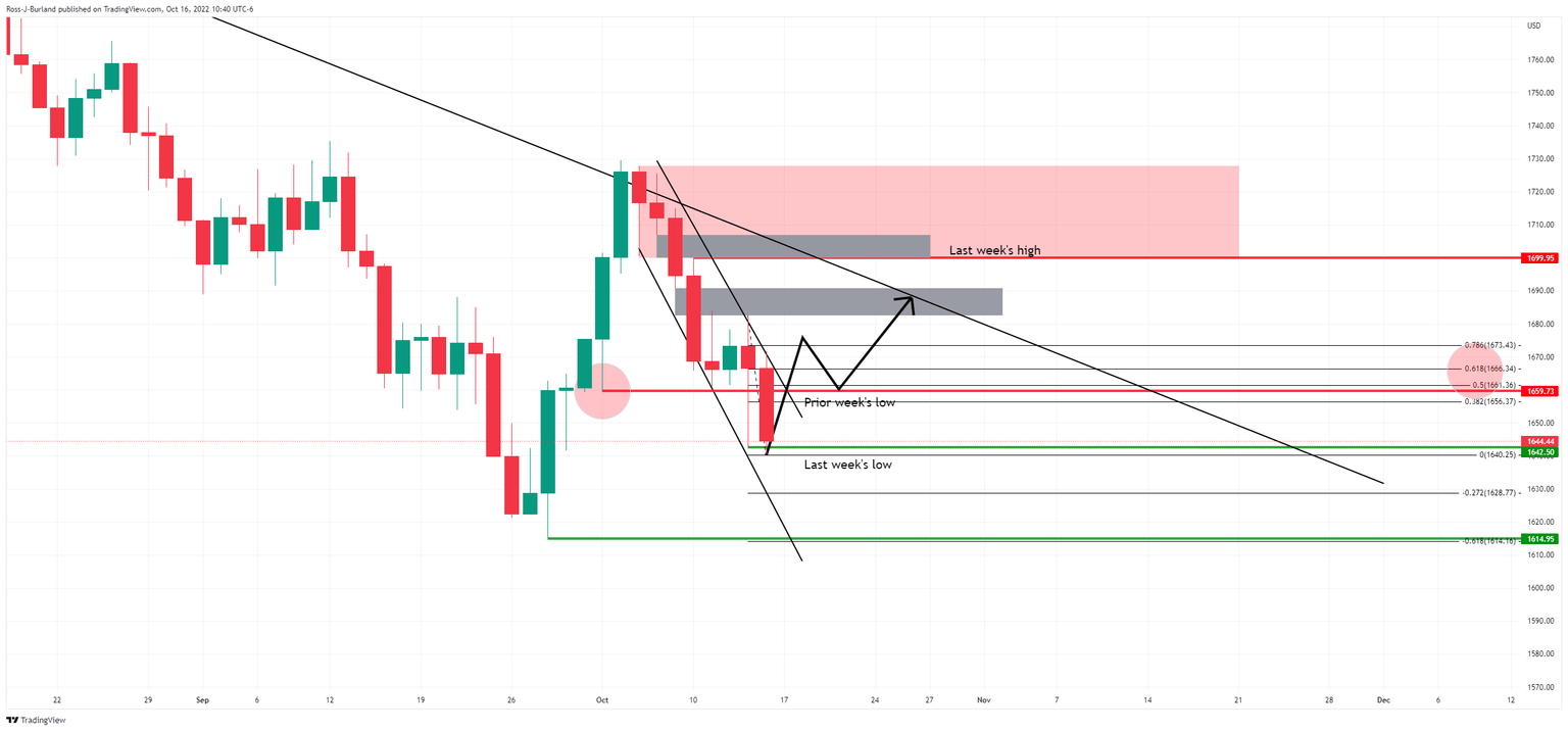 As illustrated, the price is back below the critical $,1670 structure on the weekly chart and remains on the front side of the bearish dynamic resistance. While below these, the outlook remains technically skewed to the downside. A break of September's low of $1615 opens the risk of a 100% measured move of the most recent bullish correction to the M-formation's neckline. This puts $1,500 on the radar and for a test to the 2020 demand area below it to $1,450.