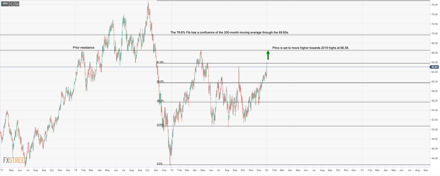 Following the escalations of tensions between the US and Iran and the US drone strike on Qassem Soleimani, head of Iran's elite Quds, oil prices are moving higher and are set to target the 2019 highs ahead of key resistance.