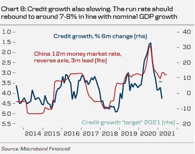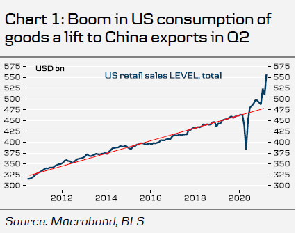 Exports to see lift in Q2: While US consumption of services has been weak, American households have spent a lot of money on goods after receiving new stimulus checks in March (chart 1). This is giving a short-term boost to Chinese exports and manufacturing in Q2 as US inventories are drawn down and US retail sales is likely stay elevated in the short term. China is still to a large extent the ‘factory of the world’. PMI export orders from NBS rebounded in March to a high level and our model points to more upside in the coming months. In H2, we expect the slowdown in China manufacturing to resume due to weaker growth in housing and infrastructure and a transition in the US and euro area consumer spending back towards services from goods.