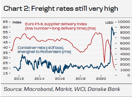 Freight rates and delivery times stay elevated for now: With the strong demand for goods there is little respite for container freight rates or delivery times, which stay elevated (chart 2). The blockage of the Suez Canal did not help. However, we look for a gradual decline in rates and delivery times during Q3, as 1) goods spending moderates again, 2) more shipping supply enters the market and 3) vaccinations reduce port congestion as port workers will again run at full time.