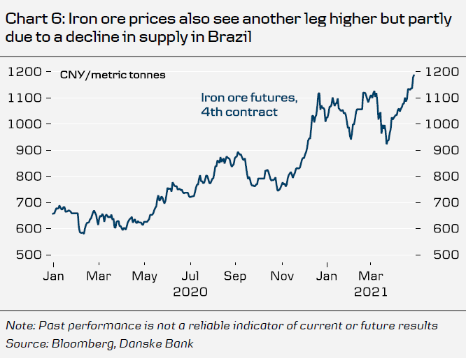 Metal prices rally again: Industrial metals such as copper and aluminium have rallied again lately in another sign, that manufacturing is still growing at a robust pace (chart 5). Iron ore prices have seen a new leg higher as well (chart 6) but it’s partly related to production challenges in Brazil.