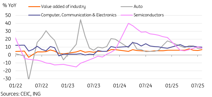 Resilient external demand led to industrial production remaining solid as well. Although the value added of industry growth of 5.2% YoY fell short of forecasts, it's still a relative outperformer. Key bright spots include continued strong growth in hi-tech manufacturing (9.3%), rail, ships, and aeroplanes (12.0%), autos (8.4%), and computers (9.9%). Many of China's faster-growing categories have a limited reliance on the US market. As such, they are likely to continue to outperform.