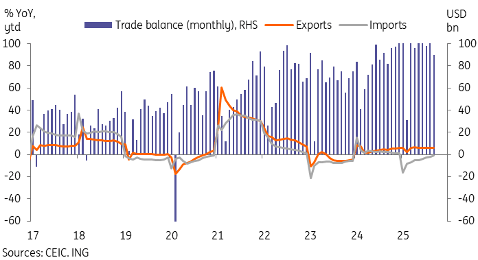 The September data was encouraging, but the overall trend remains uncertain. Moving forward, the fourth quarter should benefit from a relatively supportive base effect for imports. But unless domestic demand recovers by more than expected, growth looks likely to moderate from September's levels.