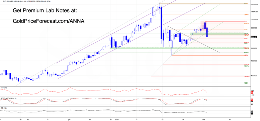 Silver: watch daily close relative to the wedge and the 8234-8460 gap. As long as price finishes day above them, in our opinion, there are no aggressive short bias. However, a confirmed breakdown will likely open the way to around 7000–7200 in the coming day(s).
