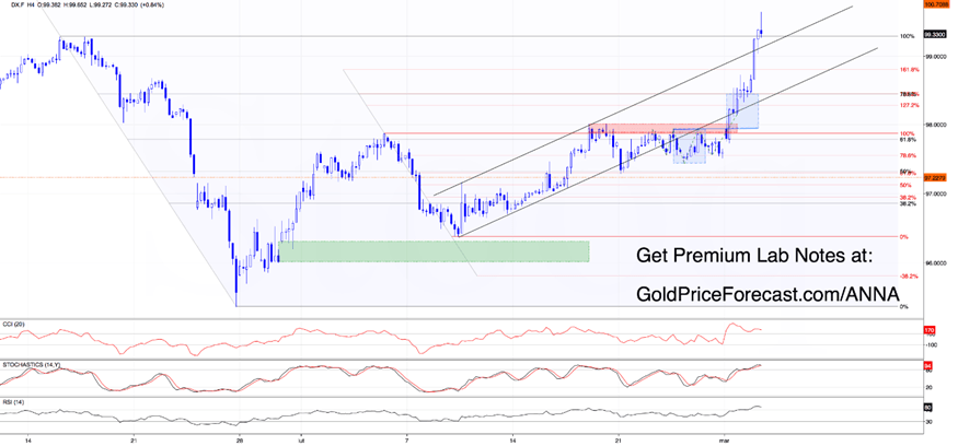 If bulls manage to close the day above 99.30 the path toward 100 and the November highs will open (especially since the greenback is already trading above the previously broken red downtrend line).