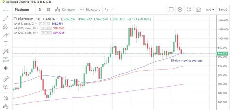 PLATINUM closed below the 55-day moving average at 967.0 yesterday, the first time it has done so since December 9. Speculative investors were net sellers of platinum for a third straight week to February 18, CFTC data show, and net long positions are now at the lowest since the week of December 24.