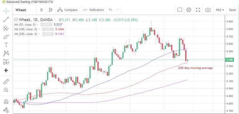 WHEAT prices have fallen for the past four sessions and are testing the 100-day moving average at 5.3466. That moving average has supported prices since October 11. The commodity is falling victim to a firmer US dollar and fears that the virus outbreak could reduce China’s demand for US agricultural produce.