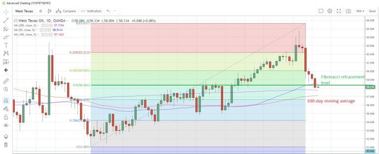WTI opened below the 50% retracement level of the rally from October to January at $58.36 this morning, the first time it has done so since December 6. The 100-day moving average is at $57.14 and has supported prices for six weeks.