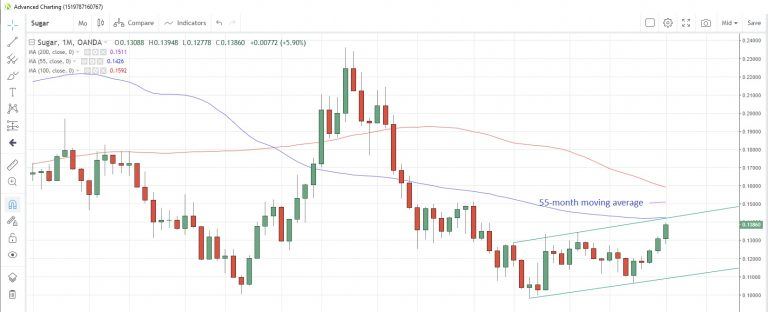 The 55-month moving average is at 0.1426, and has capped prices since May 2017. There is also the upper band of a rising channel around the 0.1415 level.