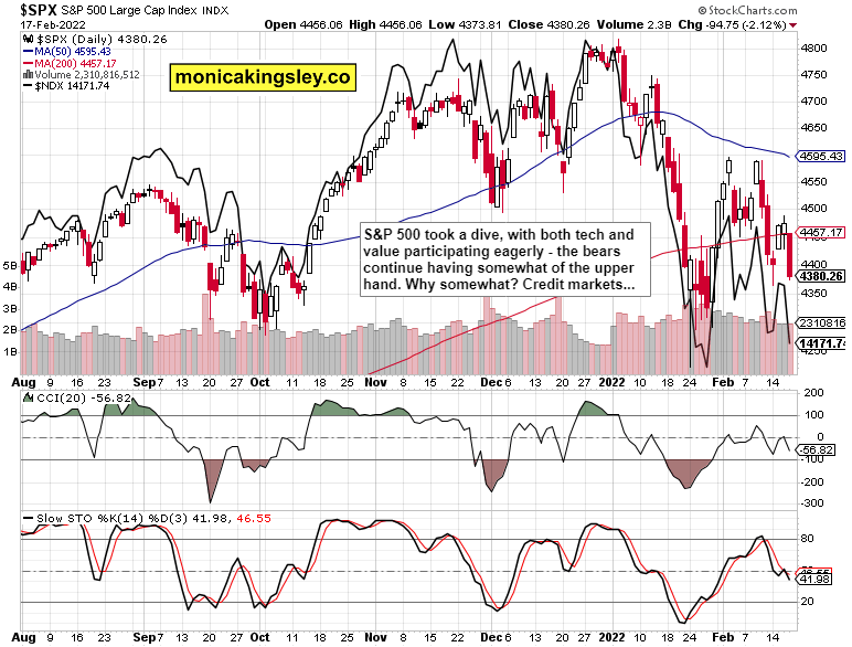 S&P 500 plunged with broad participation, a bit more than could be expected by the credit markets action. The bulls lost a good intraday opportunity to move above 4,420, and now it‘s up to the credit markets to… confirm the carnage as today‘s title says. The single oddity has been the tech slide with Treasuries moving higher (what a contradiction as Fed‘s Bullard just mentioned the need to move now before inflation gets out of control), but that could be amplified by the ARRK contribution to the selling pressure.
