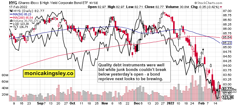 S&P 500 bulls were nowhere to be seen yesterday, but there are green shoots of upcoming upswing attempt in the credit markets – unless these confirm yesterday‘s carnage with more of a risk-off turn today. Today‘s session is likely to be volatile, with the direction set by the tech – the bears have the slight advantage. Precious metals and select commodities are likely to be winners as these bull runs continue – it‘s a very strong omen that gold and miners are leading this convincingly. Silver and more of the commodities space would join once it becomes apparent that the Fed‘s inflation quelling attempts are insufficient, and that each subsequent verbal hawkishness produces less bang for the buck. Long past is the June 2021 FOMC shock.