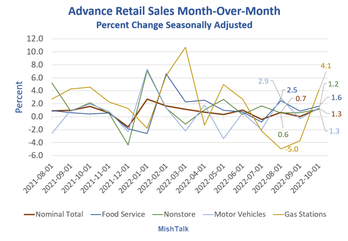 Advance estimates of U.S. retail and food services sales for October 2022, adjusted for seasonal variation and holiday and trading-day differences, but not for price changes, were $694.5 billion, up 1.3 percent from the previous month, and 8.3 percent above October 2021.