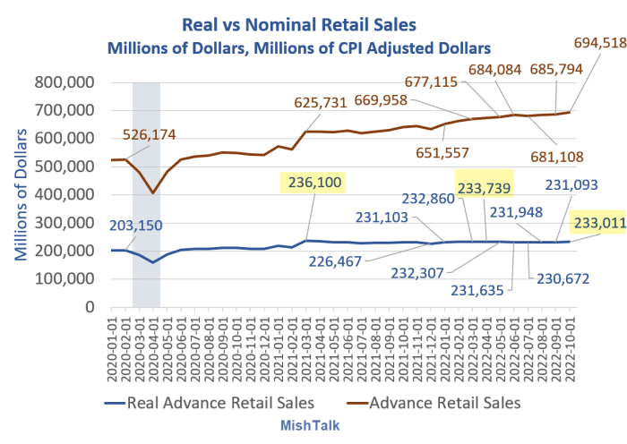 Real vs nominal retail sales, data from Commerce Department and the BLS, chart by Mish