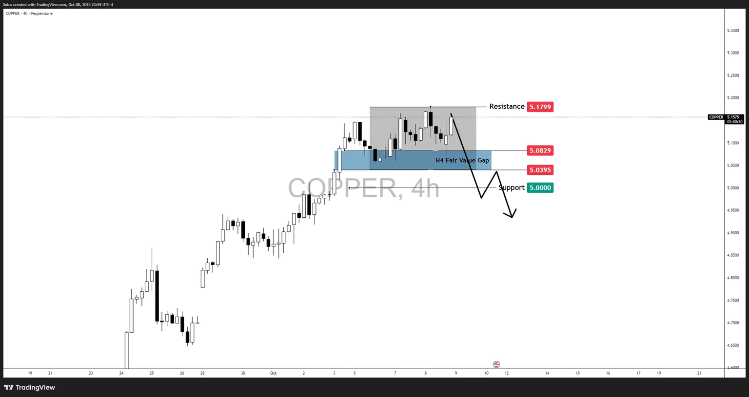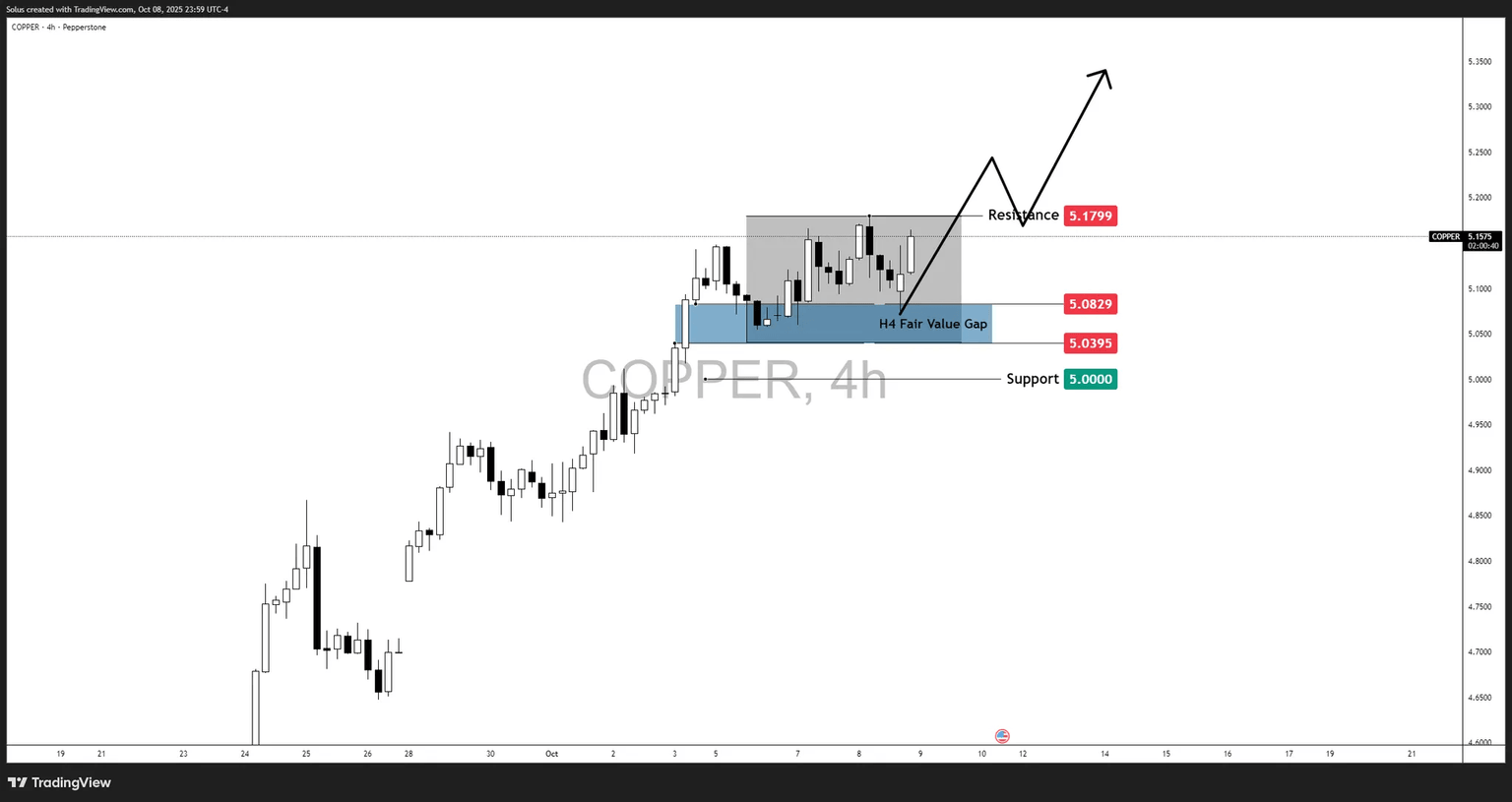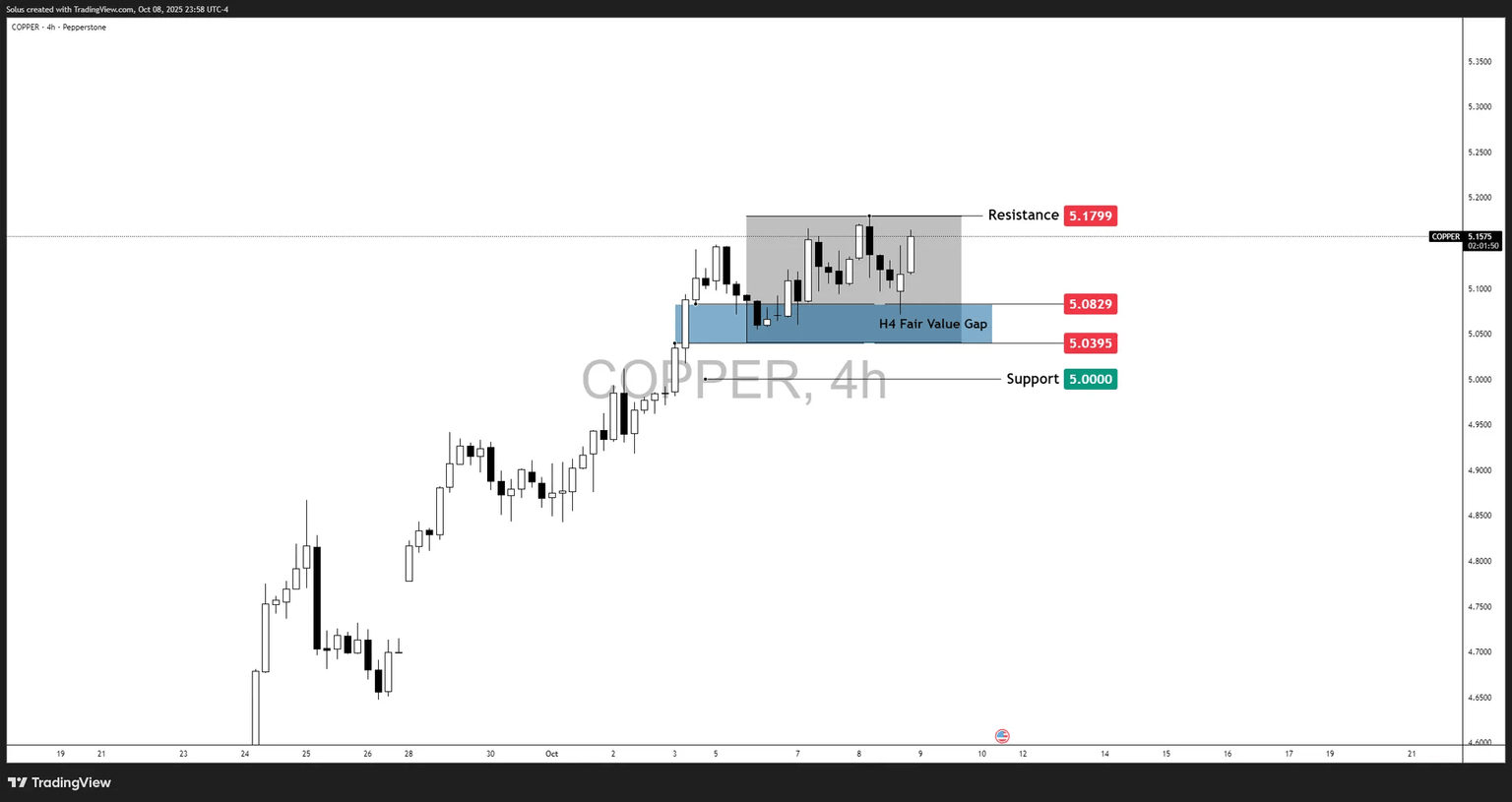 Copper’s 4-hour structure now paints a classic accumulation range within an ongoing uptrend, with price oscillating between a defined resistance at $5.1799 and a support shelf at $5.0000.