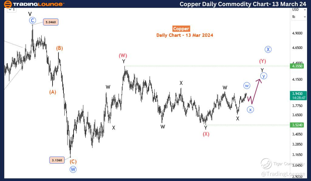 Examining the larger framework on the daily timeframe, Copper's price trajectory reveals a complex corrective structure known as a double zigzag correction. This correction commenced from 3.136 in July 2022 and has since progressed through two distinct legs: wave (W) concluding at 4.355 in January 2023, followed by wave (X) terminating at 3.524 in October 2023. Presently, the focus lies on wave (Y), which is evolving into another double zigzag pattern. Projections suggest potential extensions to levels around 4.45 and 4.90. Notably, both waves W and X of (Y) have completed, with wave Y showing signs of continued upward momentum.