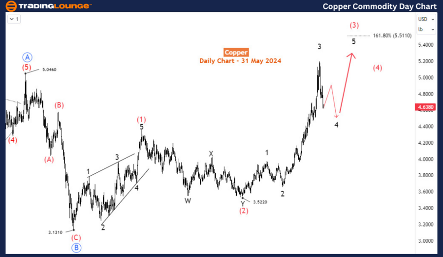 The daily chart indicates that a corrective structure concluded at 3.131 in July 2022. This correction followed an impulse wave that began in March 2020 and ended in July 2022 at 5.046. The high at 5.046 and the low at 3.131 are labeled as primary degree waves A and B (circled in blue), respectively. The corresponding wave C (circled in blue) started at the 3.131 low in July 2022 and has developed into a bullish impulse wave sequence. Currently, the price is in intermediate wave (3) of blue wave C, which is expected to extend to at least 5.511, suggesting further upside potential. The ongoing pullback is identified as wave 4 of (3). Once wave 4 concludes, wave 5 should advance towards 5.511. To gauge the completion of wave 4, it is essential to analyze its sub-waves and emerging structure.