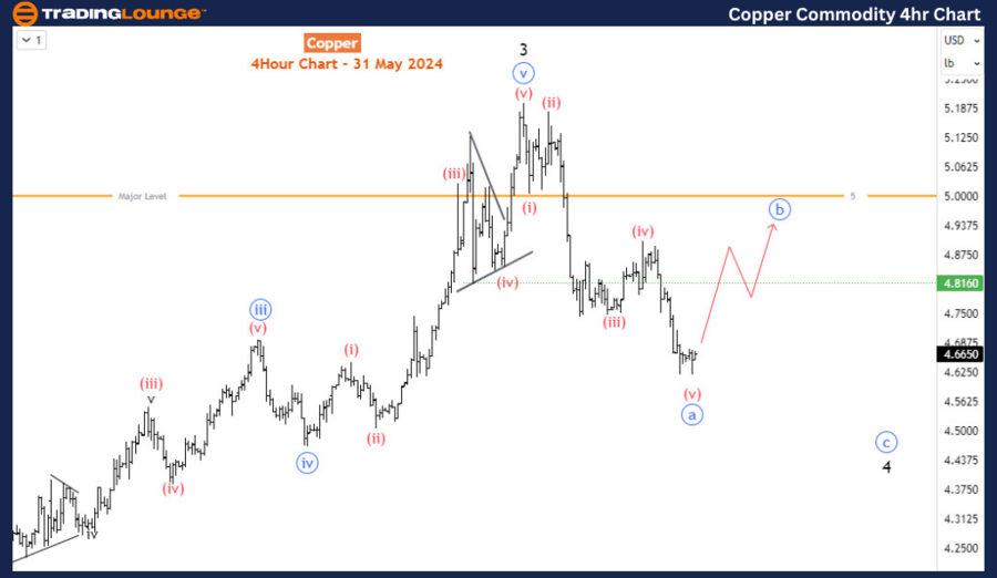 In summary, copper prices are in a pullback phase from a significant impulse wave, and buyers should wait for this correction to conclude before entering the market. The larger bullish structure that started in July 2022 is still intact, with intermediate wave (3) of blue wave C potentially extending to 5.511. The current pullback, identified as wave 4 of (3), is forming a zigzag pattern, with the H4 chart showing the development of waves a-b-c. Monitoring the completion of wave 4 will be crucial for timing the next entry point, as wave 5 is expected to push prices higher towards the target of 5.511.