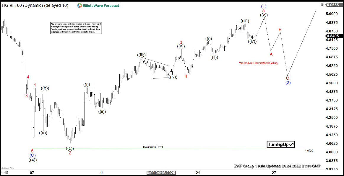 Expect cycle from April 7, 2025 low to end soon with wave 5 of (1) and the metal to see a 3 waves pullback. However, as long as pullbacks remain above the 4.03 low, copper is expected to see more upside. The Elliott Wave framework continues to support a bullish bias for $HG in the near term.