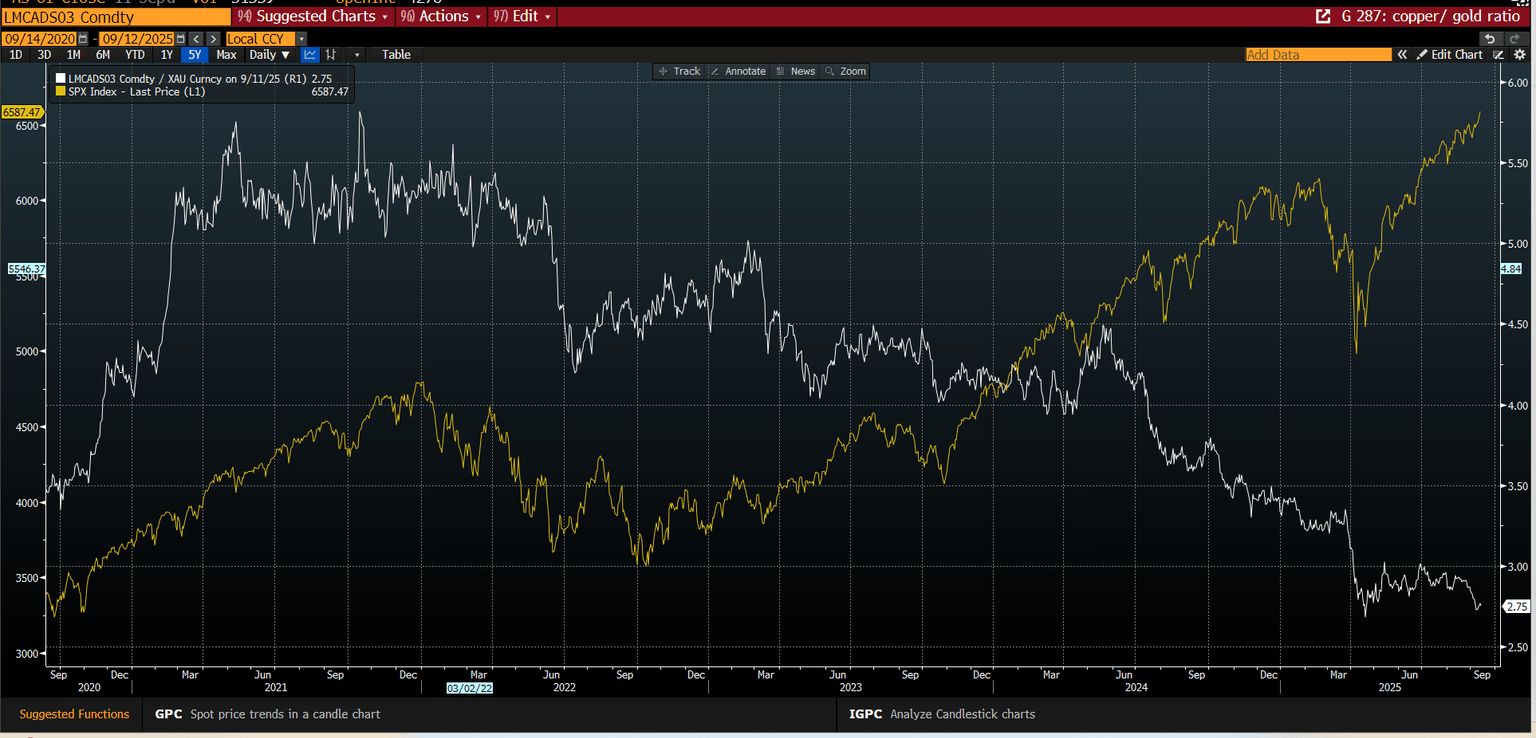 Chart 2: The Copper/Gold ratio and the S&P 500 (yellow line)
