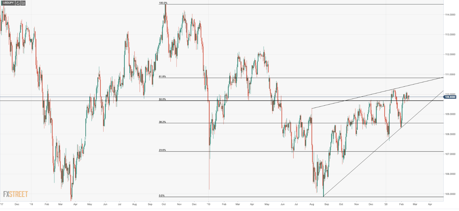 As markets continue to cheer positive updates to the virus being contained and international survival rates, whatever risk has been priced into the yen will quickly be unravelled which could be leading to further gains in USD/JPY with the golden ratio, 61.8%, Fibonacci retracement as a keen initial target around the 111 handle. However, the bearish wedge formation could act as a strong barrier for further gains much beyond the target.