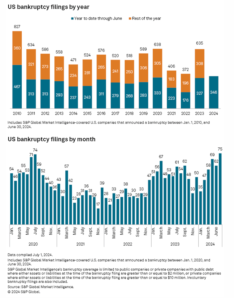 According to S&P Global data, 75 corporations filed for bankruptcy in June alone. That drove the number of filings through the first six months of 2024 to 346, “higher than any comparable figure in the prior 13 years.”