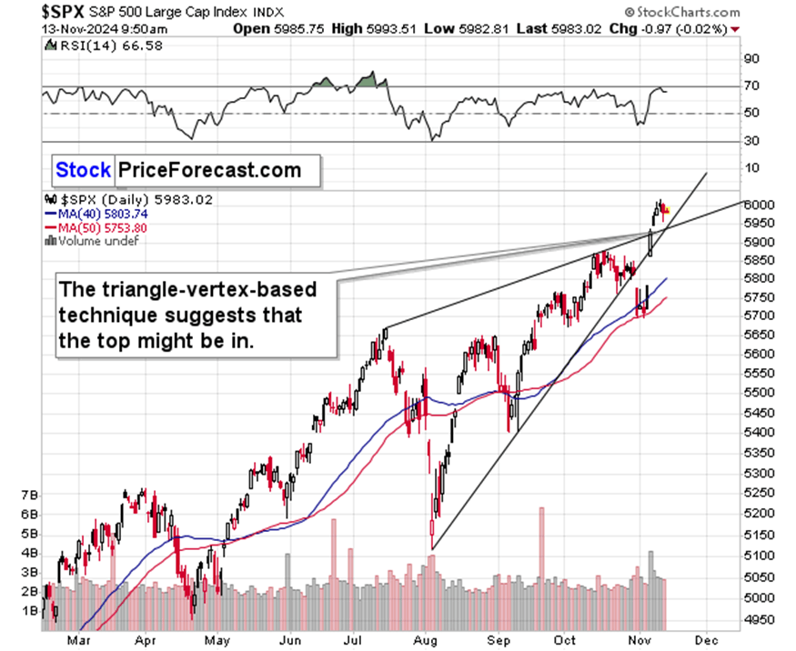 Second, the S&P 500 just invalidated the move above the very round (so, important from the psychological point of view) 6,000 level. This invalidation happened in terms of the closing prices, which makes it even more important than if we saw it just in intraday terms.