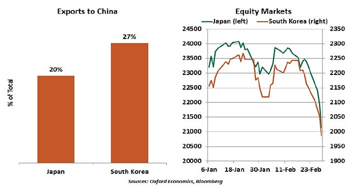 Japan and South Korea are highly vulnerable to supply chain disruptions. China is both the biggest export market in the world and a key source of goods imports for both countries. In addition, the outbreak threatens to slow domestic demand as residents spend more time in isolation.