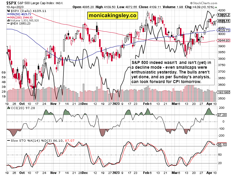 S&P 500 buyers stepped in quite early indeed – no surprise as the sell into the open couldn‘t yet have lasted. Even the battle around intraday lows spelled the return of the bulls. The table was set for no selling into downswing attempts, and sure enough stocks closed on a relatively fine note, which favors more of the back anf forth price action today – before tomorrow‘s likely 5.4% YoY CPI gets celebrated by the Fed pivot afficionados: