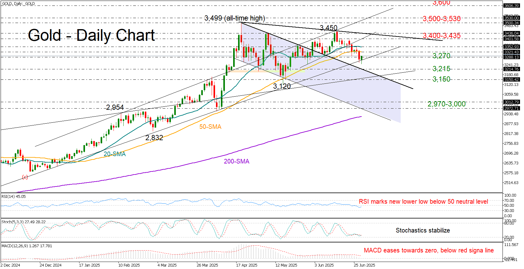 Technically, the risk remains tilted to the downside in the short-term picture given the weakening momentum in the RSI and MACD indicators. The RSI is printing new lower lows below its neutral 50 mark. If bearish pressure intensifies in the coming sessions, the price could retest the upper band of the former bearish channel at 3,215, followed by the rising support line from October 2024 at 3,150. A drop below that level could accelerate losses toward the psychological 3,000 mark, or even lower to 2,970.