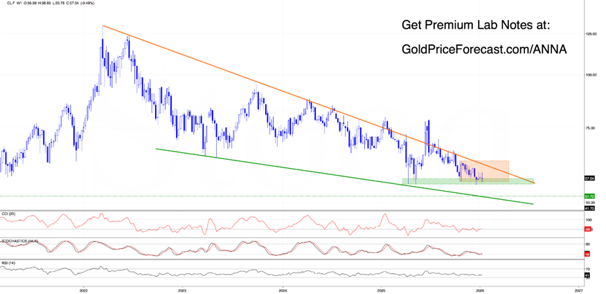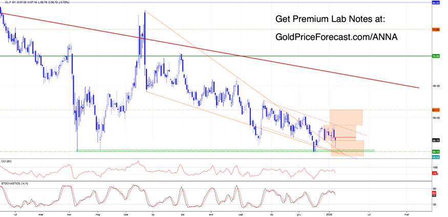 Therefore, if bulls lose it the market will likely extend losses. Why? Because if black gold closes below the orange consolidation, the next technical magnet will be the retest of the above-mentioned upper line of the orange wedge (daily).