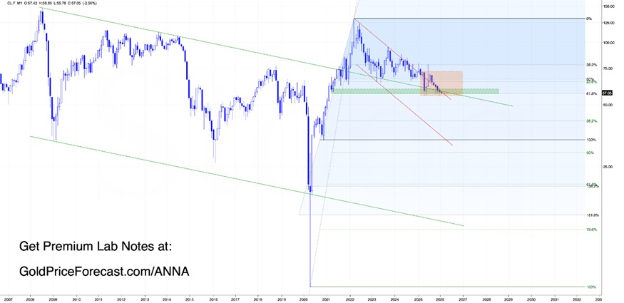 From this perspective, we see that crude oil is consolidating for over half year right above very important supports: the 61.8% Fib retracement of the 2020-2022 bull run and the upper border of the old green declining channel.