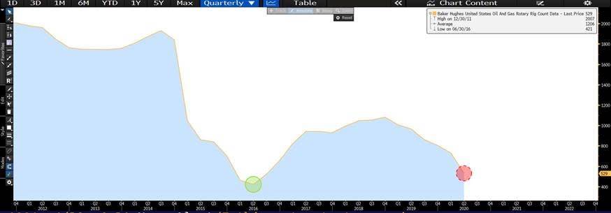 The same rig count measure has started to fall from its peak level now, but we are still nowhere close enough to find the same level – the level that pushed oil prices higher back in 2016. To put things in perspective, the US total rig count is down 51% from its December 2018 peak, but it is still up over 25% from its recent low. The interesting element about rig count is that it doesn’t work like a light switch, meaning they don’t go down or up instantly. It takes time for rigs to go offline due to the complexities in nature of the business, such as terms of contracts and rigs’ operation level.