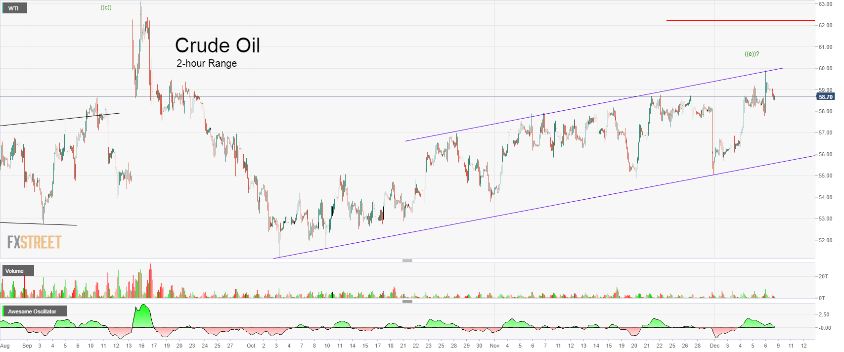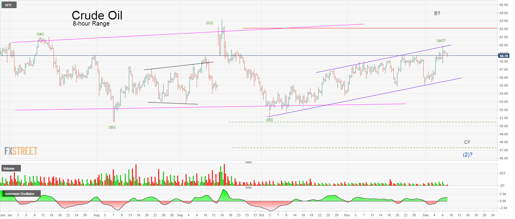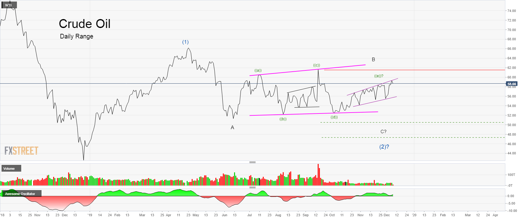 Crude oil, in its daily chart, reveals that its price continues moving in a consolidation structure as an ascending expanding triangle. At the same time, in the near-term, the price action runs in an ascending channel, which reached the $59.90 per barrel on December 06.