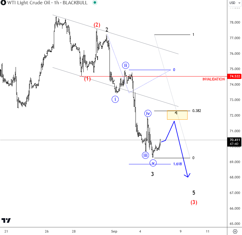 Crude oil firstly rallied for a bit yesterday, on the news that OPEC's planned production increase starting in October will be delayed. However, that rally was short-lived. It's important to note that production increases are still on the horizon, and this should have a bearish impact on energy prices. It's not surprising that energy retested the lows later during the US session, suggesting that the decline remains strong. From an Elliott Wave perspective, the move appears impulsive, so I expect further weakness after a potential wave 4 rally, which could head back to the 71-72 resistance area. The invalidation level is at 74.57, and as long as this holds, the trend for crude oil remains bearish.