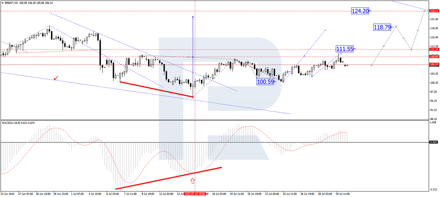 On the H4 chart, Brent is forming the third ascending wave with the target at 111.55 and may later correct down to 106.16. After that, the instrument may resume trading upwards with the short-term target at 118.80. From the technical point of view, this scenario is confirmed by the MACD Oscillator: its signal line is moving above 0 inside the histogram area. Both the line and the price chart may yet continue to move upwards.