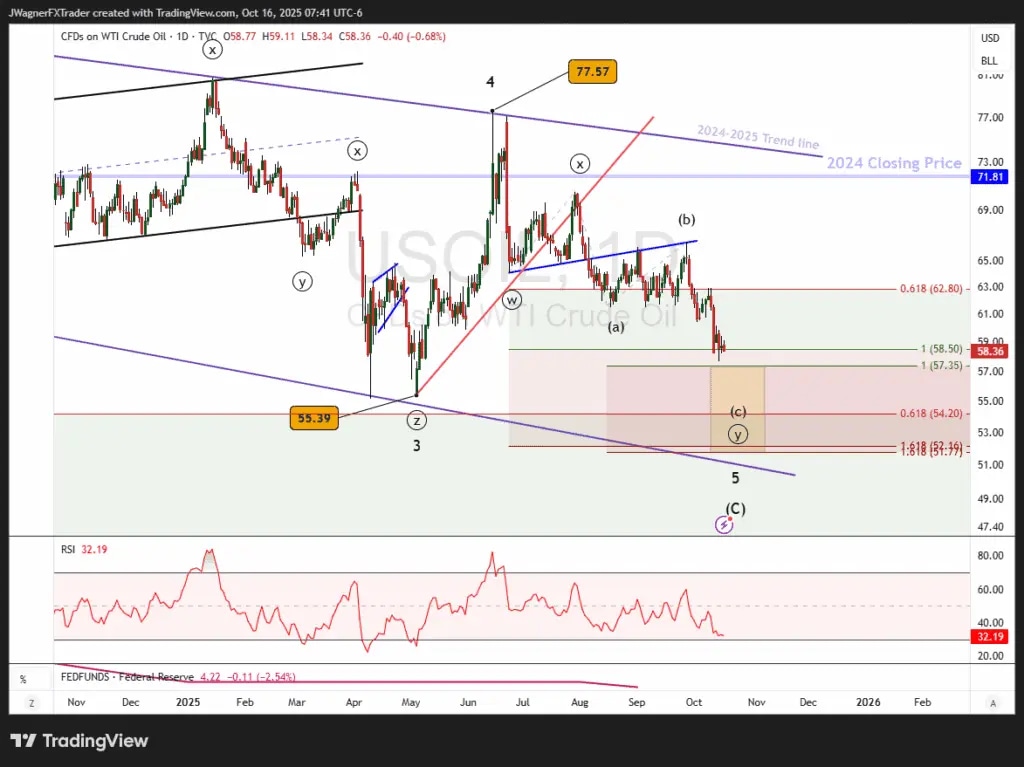 Crude oil appears to be nearing the end of a large ending diagonal pattern that began September 2023. We estimate a downside target, using Elliott wave principles, to be $51.77 – 57.38