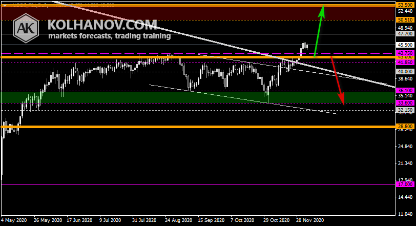 An downtrend will start as soon, as the market drops below support level 43.00, which will be followed by moving down to support level 36.10 – 33.60.