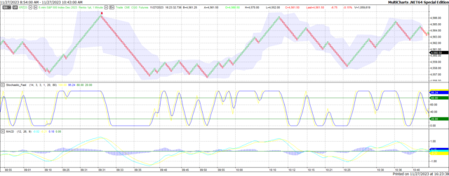 Yesterday we saw a very Mixed Market in the AM hours. The one clue we had that a Downside Day was imminent was the Bonds and Gold trading Higher as this signified a Downside Day. Despite all the hype regarding Cyber Monday, it didn't seem to do much to propel the markets forward, in fact they fell across the board. Not by much mind you but the markets didn't advance by the end of the session. The actual sales numbers to be reported regarding Cyber Monday will be released at a later date. We have just heard that the current ceasefire or "pause" in the Israel Hamas war was extended by two days so to give more freedom to both Israeli and Palestine prisoners. We will continue to monitor this situation and report on it as applicable. It is of course good news that this is happening. Today we have about 9 reports, most of which are FOMC Members speaking.