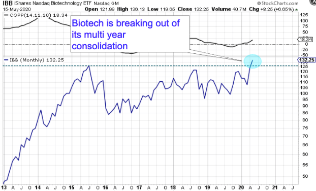 With Biotech breaking out of a multi year consolidation they are indicating a readiness for assuming market leadership.