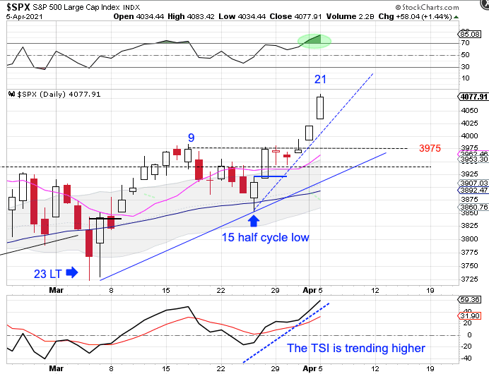 Monday was day 21 for the daily equity cycle. The new high on day 21 shifts the odds towards a right translated daily cycle formation. However, stocks are becoming stretched above the 10 day MA. Stocks will need to consolidate at some point to allow the 10 day MA to catch up to price. But if stocks too stretched above the 10 day MA we could then there will be a risk of a sharp correction. We will use a swing high and a break below the accelerated (blue dashed) trend line to signal the daily cycle decline.