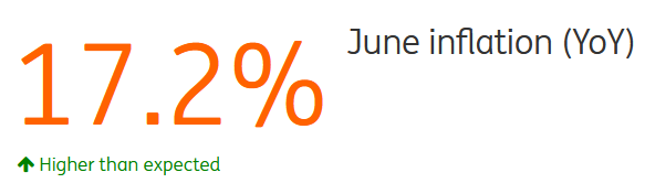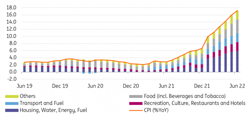 Unsurprisingly, food, housing, energy and fuel prices drove inflation again in June. However, the month-on-month rate of headline CPI slowed slightly from 1.8% to 1.6%. The picture also remains the same from an annual perspective. The growth of consumer prices amounted to 17.2% year-on-year in June, which was 1.2pp up on May. Prices of goods in total went up by 19.3% and prices of services by 13.9%.