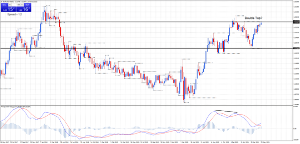 On the weekly chart we may be seeing a double top. Price has moved up to resistance at 1.2243 and then sold off during last Friday’s trading. MACD on the weekly has shown negative divergence and this current move up could be the last weekly rally before a longer-term decline.