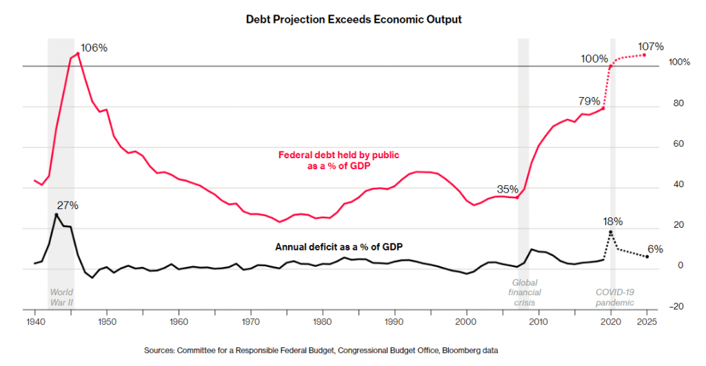To put that into everyday language: The U.S. is on a mid-term path to either default or hyperinflation unless its spending policy changes significantly. The “free money” environment that allows governments to take debt at no or even negative cost is unsustainable. The U.S. and Western economies have reached historically high levels of leverage. Further debt-driven growth seems less likely than a deleveraging process in the near future. Growth has been subdued in comparable situations historically. The best results (least painful) occurred in periods of moderate inflation. It should be therefore quite tempting for policymakers to target an inflation rate of 4-5% along with economic growth. This figure effectively halves the total debt burden during a 10-year period.