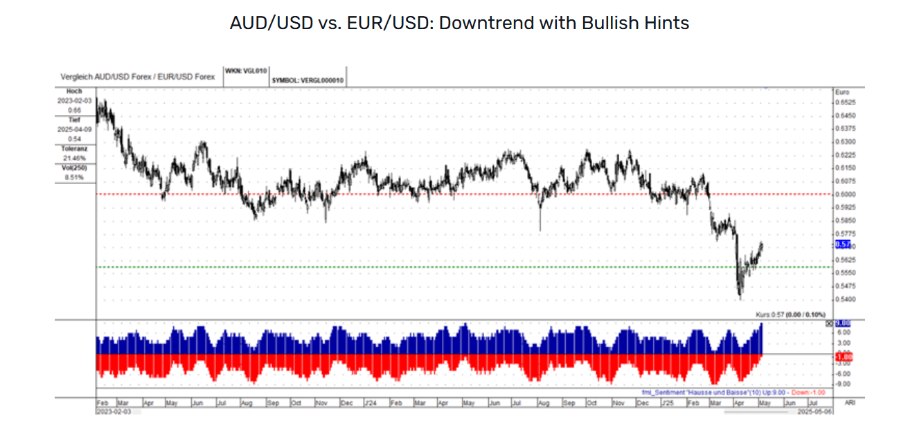 The trend for GBP/USD against EUR/USD displays more range-bound behavior with significant fluctuations. However, a noticeable downtrend has emerged in the recent period, similar to the AUD/USD pair. The sentiment indicator for this pair also shows a recent increase in bullish sentiment following a period of bearishness. High volatility is evident throughout this chart, demanding careful risk management.