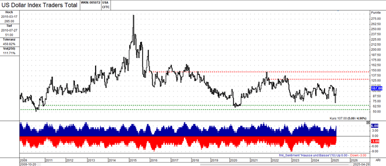 This chart offers a fascinating glimpse into the collective mindset of traders involved with the US Dollar Index. Rather than showing the price itself, it tracks the net long or short positions held by these traders over time, providing valuable insights into prevailing market sentiment.