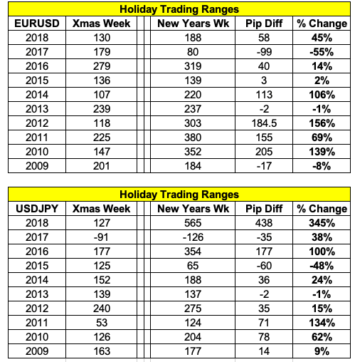 Looking ahead, New Years week is typically a more eventful one for currencies. As shown in the table below, in most years, the trading ranges for EUR/USD and USD/JPY expand. You may even recall the flash crash on January 3rd 2019 that took USDJPY from 108.90 to 104.80 in a matter of minutes. Like the rally in EUR/USD on Friday, there was no specific catalyst outside of beginning of the year position adjustments. Data wise, there's not much on the calendar to trigger a big move but surprising strength or weakness in Chinese PMIs, US ISM or German labor data could do the trick in a week of low liquidity. Investors are still in holiday mode in the front of the week and it won't be until after the New Year on Thursday that liquidity starts to normalize.