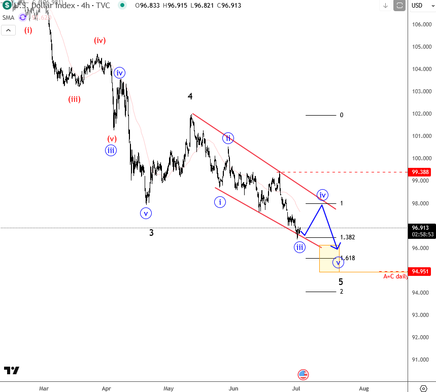 In general, it looks like the US could come out of this in a strong position, possibly driving stocks even higher at some point. But lets keep in mind the usual inverse correlation with the US dollar. If we respect that correlation and observe the five-wave decline completed in subwave "c" of three on the Dollar Index, then a consolidation, three-wave recovery could show up soon—possibly a wave four rally off that red diagonal trendline support, as discussed in our previous updates.