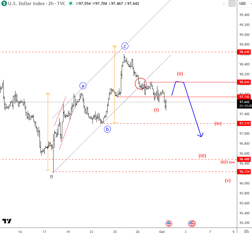 Biggest story of the week is the US government shutdown — federal government is officially closed since today, October 1, 2025, because Congress missed the funding deadline. Only essential services (like air traffic control, border security, military operations) continue, while many federal employees are furloughed or working without pay until funding is approved. As a result we are seeing some reversal down on stocks, while dollar is also weakening. Metals will most likely remain attractive, as they usually do in times of uncertainty or risk. Looking at the dollar index, we see a nice reversal through channel support after only an ABC rally from 2025 lows, which means dollar could revisit much lower prices, especially after some rebound here, possibly in subwave 2, with resistance around 98.