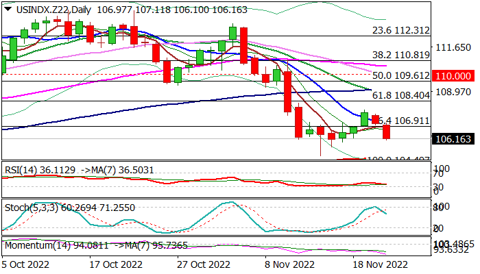 The dollar index accelerated lower on Wednesday, extending weakness into second straight day, signaling that recent recovery is likely over as fresh weakness retraced over 61.8% of 105.15/107.88 corrective leg.